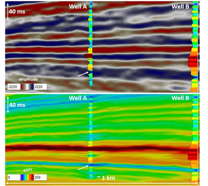 Comparison of conventional seismic (top) and TROID gamma ray. The reservoir sand is indicated by a white arrow. Well A was used to build the machine learning model. Well B is a blind well. The measured logs have a 120 Hz filter applied.