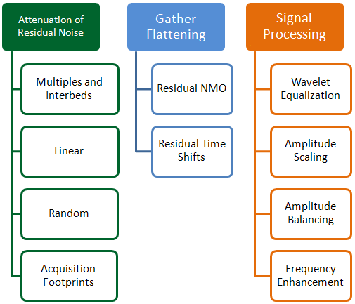Figure 1 shows various types of conditioning processes which can be applied to improve the quality of seismic data, subdivided into three segments: attenuation of residual noise, gather flattening and signal processing. A preliminary step may be an analysis of signal-to-noise (S/N) ratio for identifying whether the data has noise issues which must be addressed. If noise is in fact an issue, determining whether the noise is linear, random, or comes from multiples may be achieved by analyzing the gathers. For example, if the data exhibit residual multiples, a weighted least squares radon transform is effective in modeling the coherent residual multiples. The application of such processes to model seismic events by moveout discrimination will aid in reducing interference from multiples with primary energy. Caution is encouraged in this process given the risk of removing usable signal, especially at near offsets where the moveout differentiation between primaries and multiples is difficult to achieve. The use of forward and reverse radon transform to convert data from time-space domain to Tau-p domain and vice versa, lies on the combination of seismic velocity parameters (low and high scalar versions of the best seismic velocities available) in order to accurately mute the zones with multiples in the Tau-p domain. For this reason, a thorough examination of the seismic velocities is required. For remnant linear noise not of hyperbolic nature, several filter routines based on velocity or dip, frequency or wavenumber are available and may be utilized to remove such undesired events.